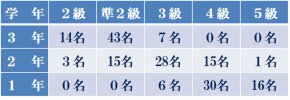 ○6月1日(金)に英語検定を実施しました。 ○日常の学習の積み重ねが大切な英語検定に昨年度も多くの生徒が挑戦し、最終的な合格者の総数は178名となりました。 ○特にも、2級合格者は一昨年度比14名増の17名、準2級合格者は一昨年度比4名増の59名となりました。 ○入学時から資格取得への意識が高く、目標を明確に設定して取り組んだ成果が表れました。 |