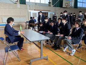 向けてのメッセージなどについて講話を行いました。スーツを着て参加した先輩の姿は高等部の生徒にとても