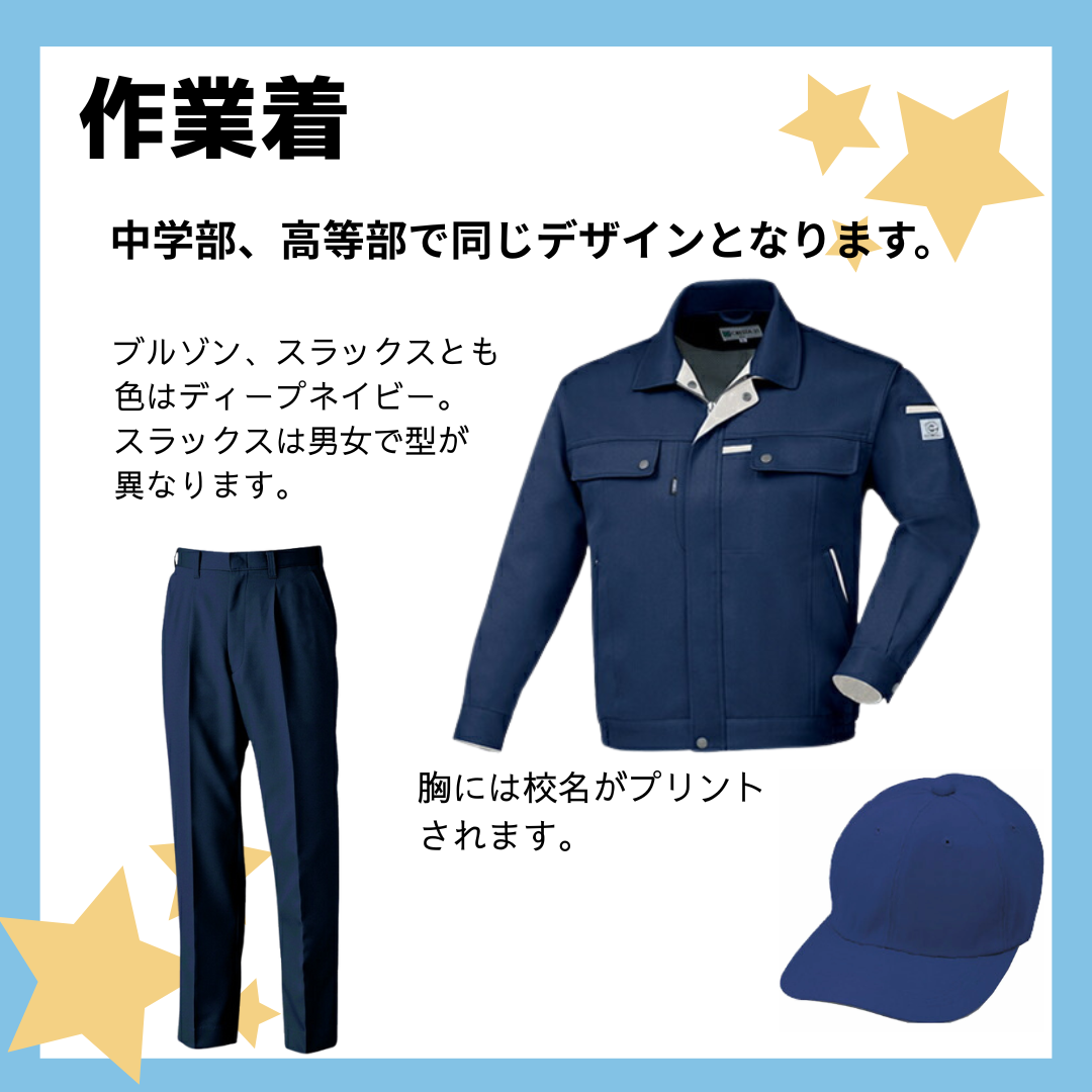 在校生については、現在の制服・運動着・作業着を引き続き着用しますが、希望する方については購入することができます。