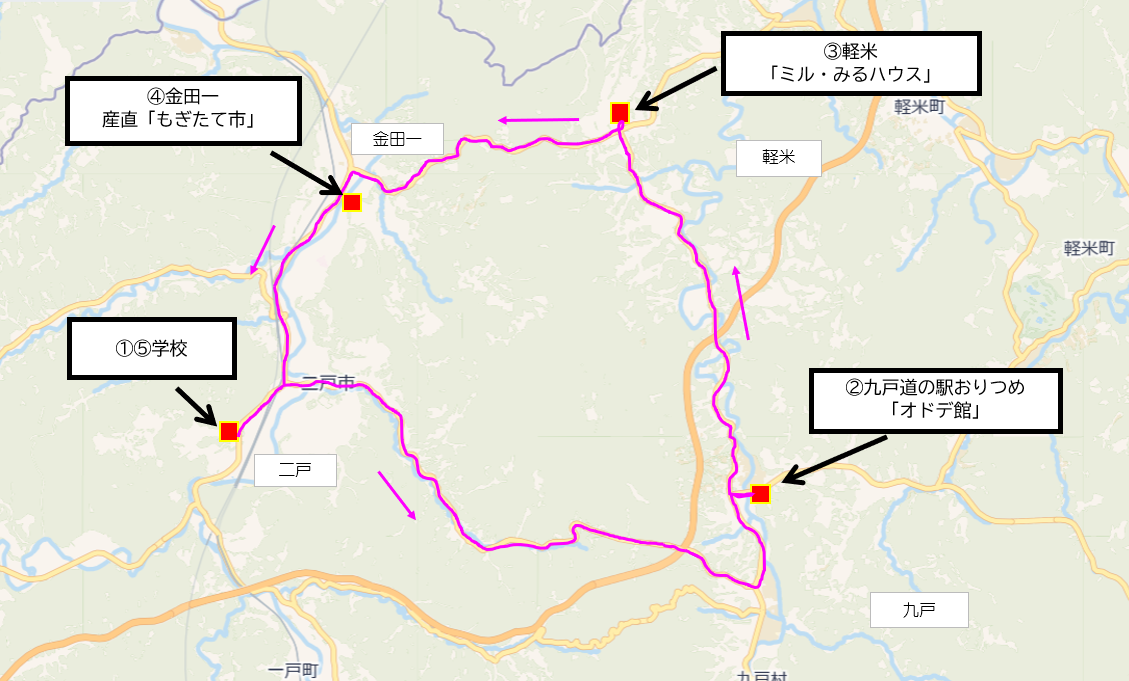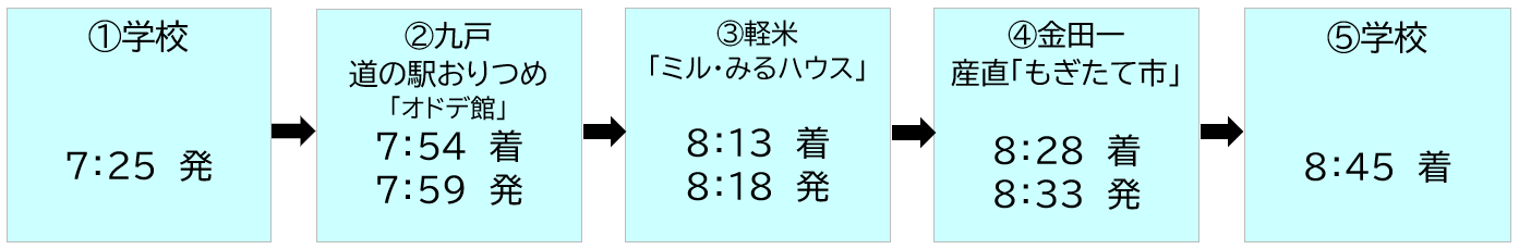 1 二戸北星支援学校では、児童生徒の通学支援を目的として、通学バス(登校便)の運行を予定しております。 2 通学バスの運行は、登校便の1本のみとなります。 3 運行ルート・時刻表は下記の通りとなります。 (1)通学バス運行ルート (2)時刻表