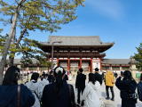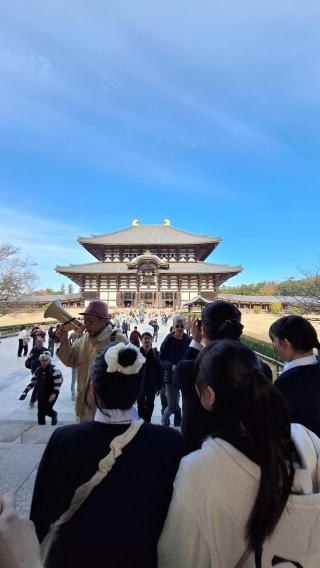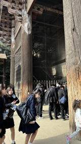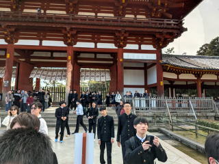 12月3日 修学旅行2日目。奈良方面の見学です。朝のホテルエレベーターで既に混雑しているそうです。午前は奈良公園、午後は薬師寺、法隆寺見学です。帰路の夕日がきれいです。